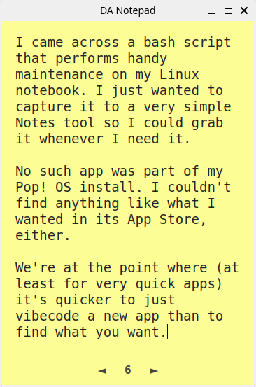 I didn't want a flexible Markdown editor that syncs across devices. I wanted a friendly note pad of fixed size, with a fixed number of pages, where I could stash little pieces of info or code or command-line stuff that I'm going to want to use again later. No backing up to the cloud, no sync services, everything local. Sort of like a clipboard with a limited, browsable History.