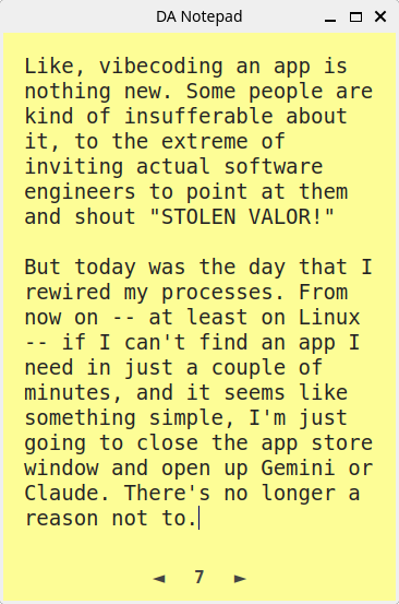This sort of vibecoding isn't in any way a big deal — particularly with an app that's as dogbone-simple as a Notes desk accessory. This is a freshman-class (high school Freshman class) Python project. Fortunately for me, Gemini and Claude can reliably deliver the goods when you're trying to create an app that could have performed well on computers built in the late 1900s, when the most scandalous thing about Bill Clinton was that he'd given a super-long-winded speech at the Democratic National Convention.