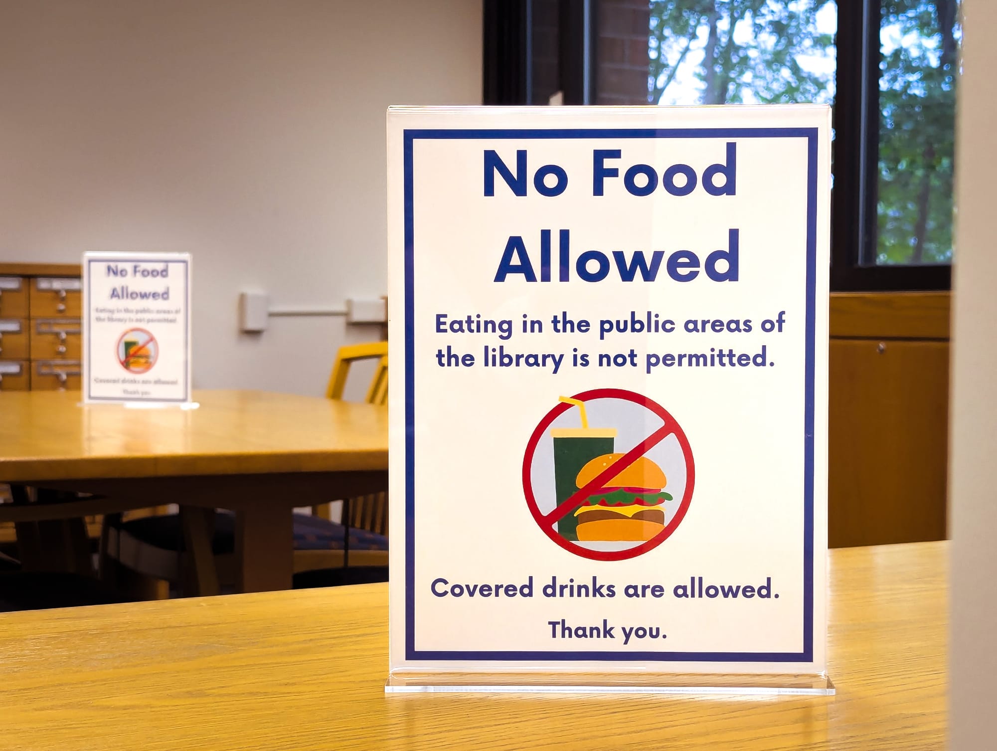 I arrived at my favorite table and I was nearly done setting up The Workspace Where All The Magic Happens (remote edition). I was literally pulling the last required items from my backpack when a librarian passed through. She was distributing new "No Food Allowed" signs here and there.