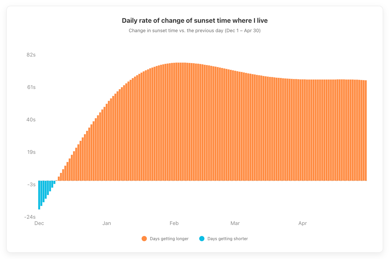 Change in sunset time vs. the previous day (Dec 1 – Apr 30)